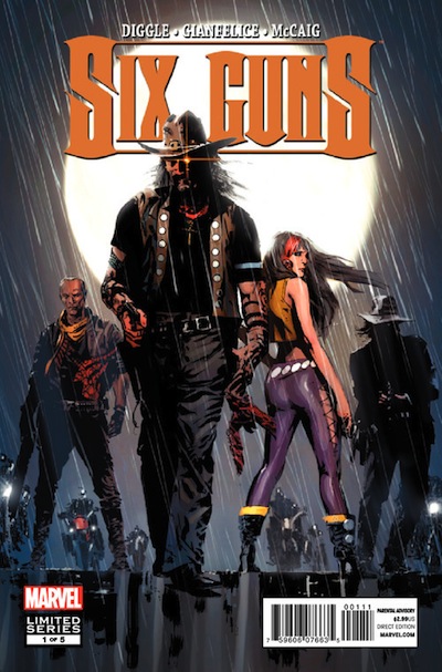 "Don't set them up if you can't take them down!" Times may have changed since the days of the Old West, but in the war-torn South American state of San Diablo, the law of the gun still holds sway. When former hero-for-hire Maria Vasquez, alias Tarantula, finds herself wanted for murder south of the border, Texas Rangers Division lawman Tex Dawson is assigned to bring her in. But they're on a collision course with the outlaw Black Riders biker gang, bounty hunter Matt Slade and the revenge-fuelled vigilante known as the Two-Gun Kid... As bullets fly and the bodycount rises, these modern-day desperadoes find themselves caught in the gunsights of a ruthless private army. And they aren't going to talk their way out of it... Five gunslingers, six guns... against six hundred! "Six Guns is big, brash and unashamedly visceral but, vitally, it also embeds intelligent social commentary at its core." - Broken Frontier